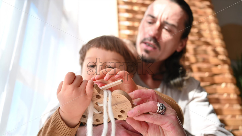 VIDEO Father playing with his son with ecological wooden toys near the window Royalty Free Stock Video Footage