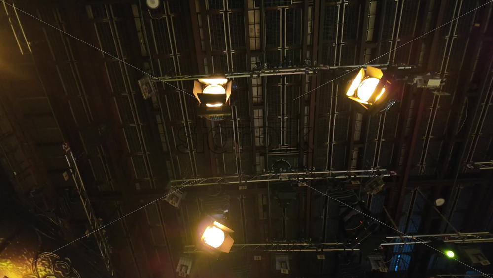 Flashing studio lights equipment on the ceiling of a TV set Royalty Free Stock Video Footage Royalty Free Stock Video Footage