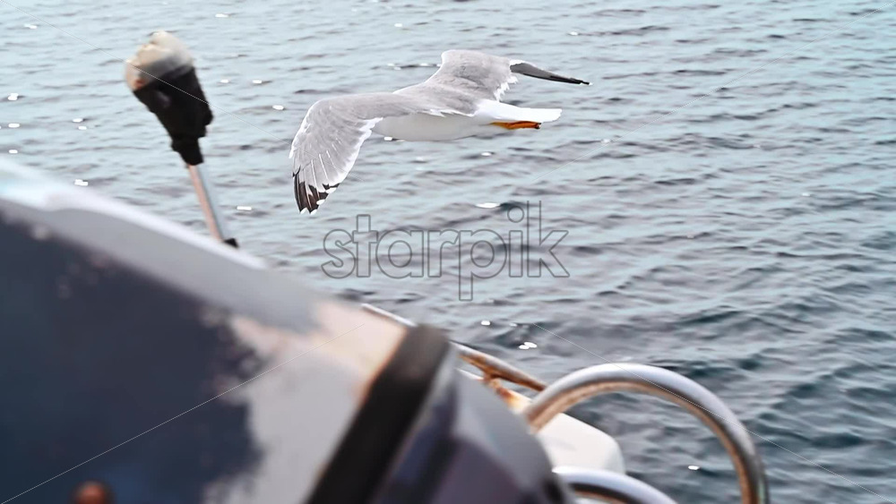 Flying seagulls near the floating ferryboat. Land in the distance. Cloudy weather. Slow motion. Greece Royalty Free Stock Video Footage