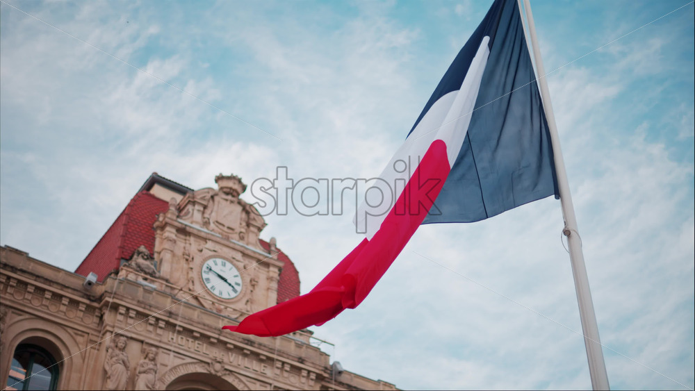 video French flag waving in front of the Mairie de Cannes Town hall in Cannes, France Royalty Free Stock Video Footage