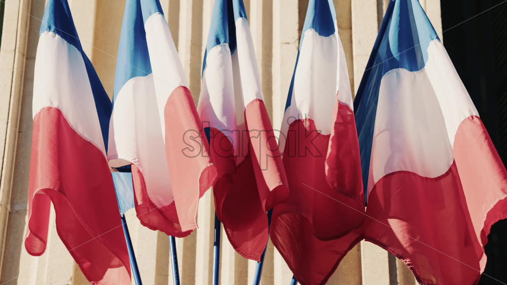 French national flags waving on the facade of a historic building in southern France Royalty Free Stock Video Footage