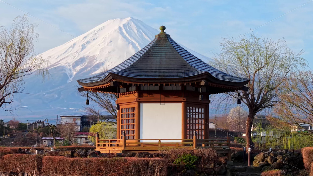 video Fujikawaguchiko, Japan – April 23, 2025: Aerial drone view of a temple with Mount Fuji on the background Royalty Free Stock Video Footage
