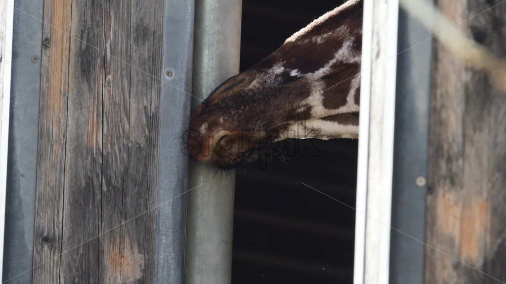 Giraffes head and snout looking out from inside a wooden stable at a zoo, licking fence Royalty Free Stock Video Footage