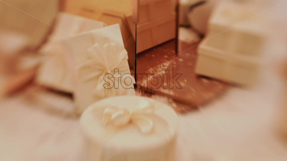 Close up of white, ribbon wrapped gift boxes arranged on a snowy decorative surface, with warm ambient lighting and festive props in the background Royalty Free Stock Video Footage
