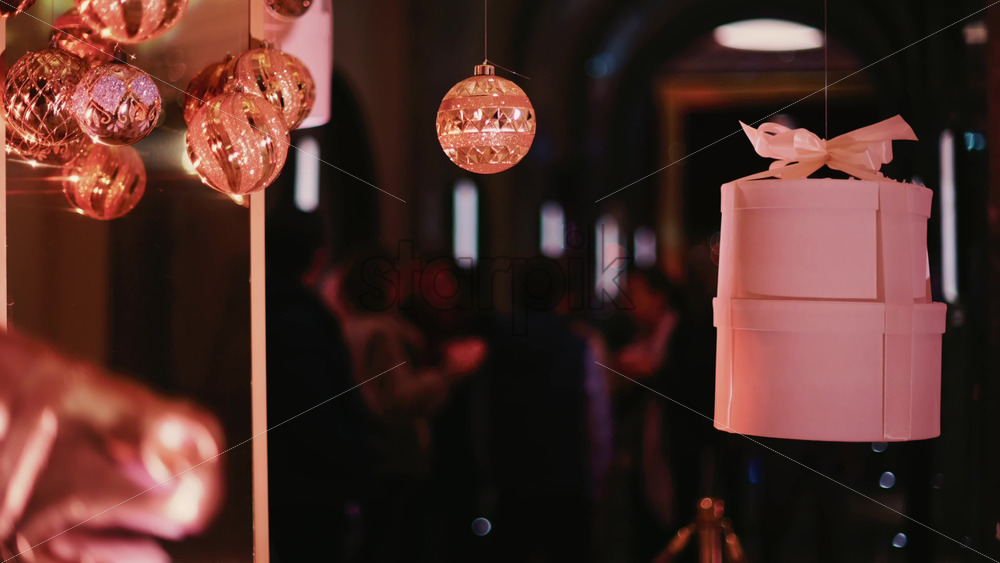 Golden Christmas baubles hanging from a structure alongside a suspended white gift box, with people blurred in the background Royalty Free Stock Video Footage