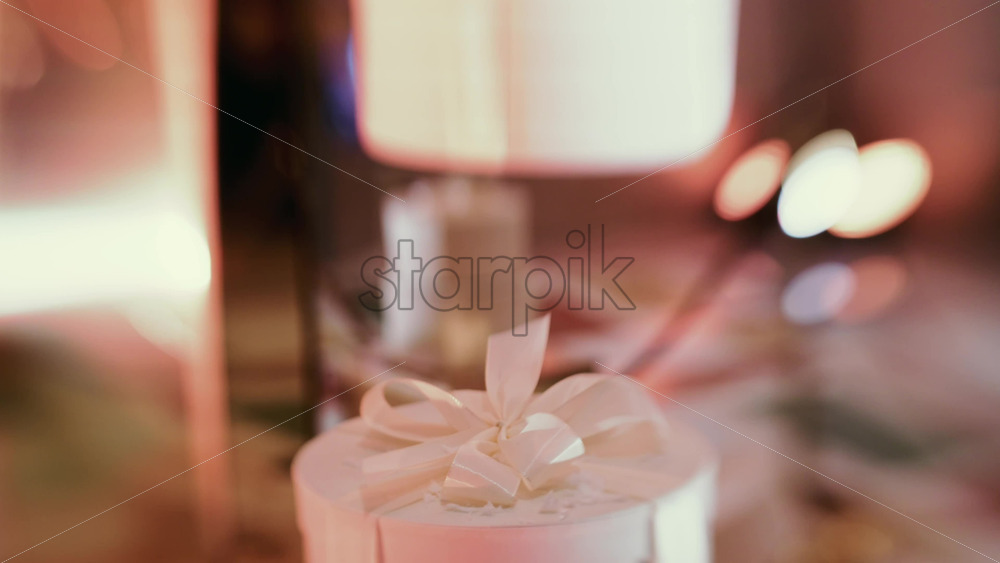 Detail shot of a round white gift box topped with a satin ribbon, surrounded by softly blurred festive decor and warm lights Royalty Free Stock Video Footage