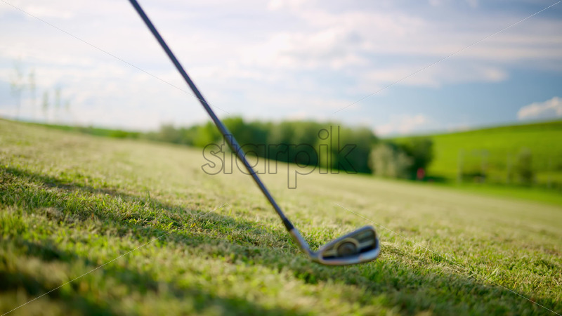 VIDEO Golf club swinging back and forth on a grass field on a sunny day Royalty Free Stock Video Footage