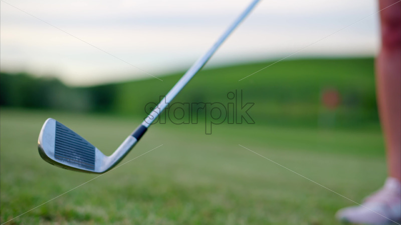 VIDEO Golf club swinging back and forth on a grass field on a sunny day Royalty Free Stock Video Footage