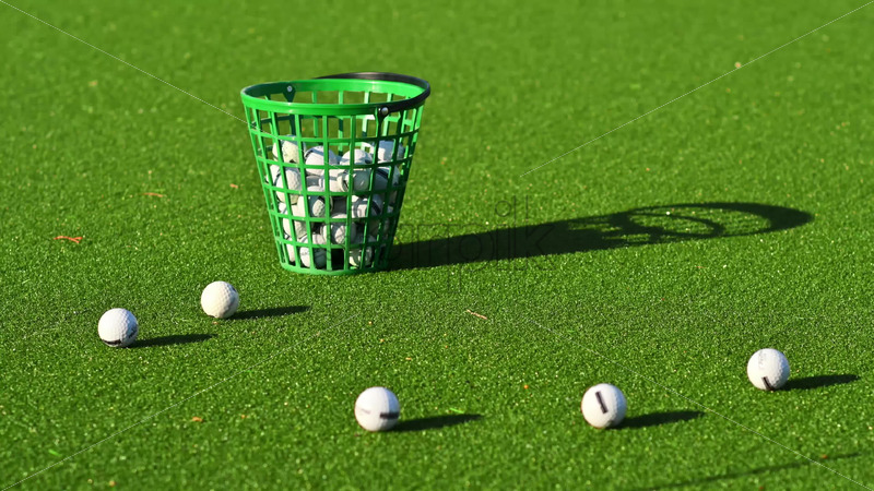VIDEO Multiple golf balls near a green bucket on a course, on a sunny day Royalty Free Stock Video Footage