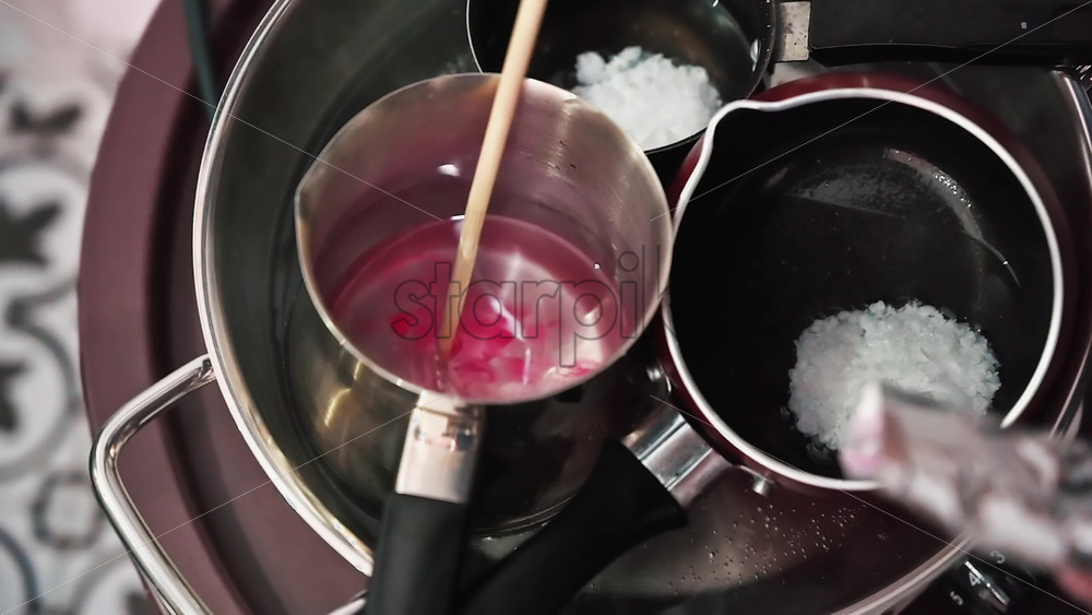 Hand made candles production, female hand mixing dye and melting wax in pots. Slow motion Royalty Free Stock Video Footage