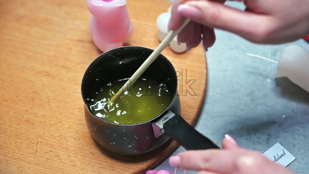 Hand made candles production, female hand mixing melting wax in a pot. Slow motion Royalty Free Stock Video Footage