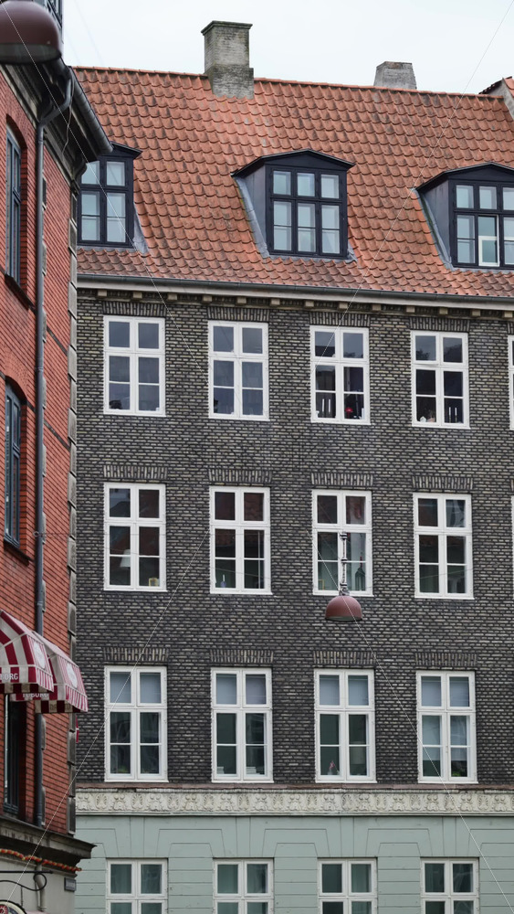 Historic brick building exterior with many windows and classic roofing, illustrating urban architecture. Copenhagen, Denmark Royalty Free Stock Video Footage