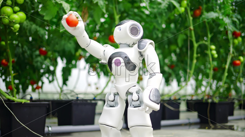 VIDEO Two humanoid robots standing near rows of tomatoes in a greenhouse farm Royalty Free Stock Video Footage