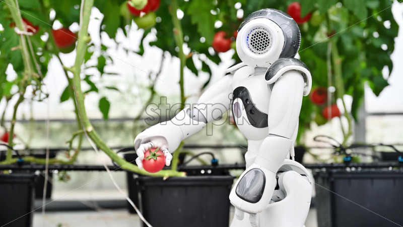 VIDEO Humanoid robot grabbing and letting go of a tomato in a greenhouse farm Royalty Free Stock Video Footage