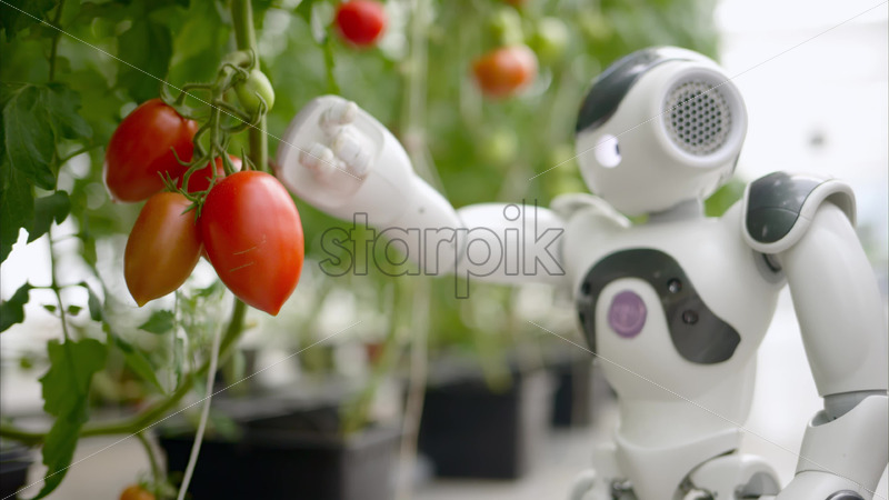 VIDEO Humanoid robot moving near rows of tomatoes in a greenhouse farm Royalty Free Stock Video Footage