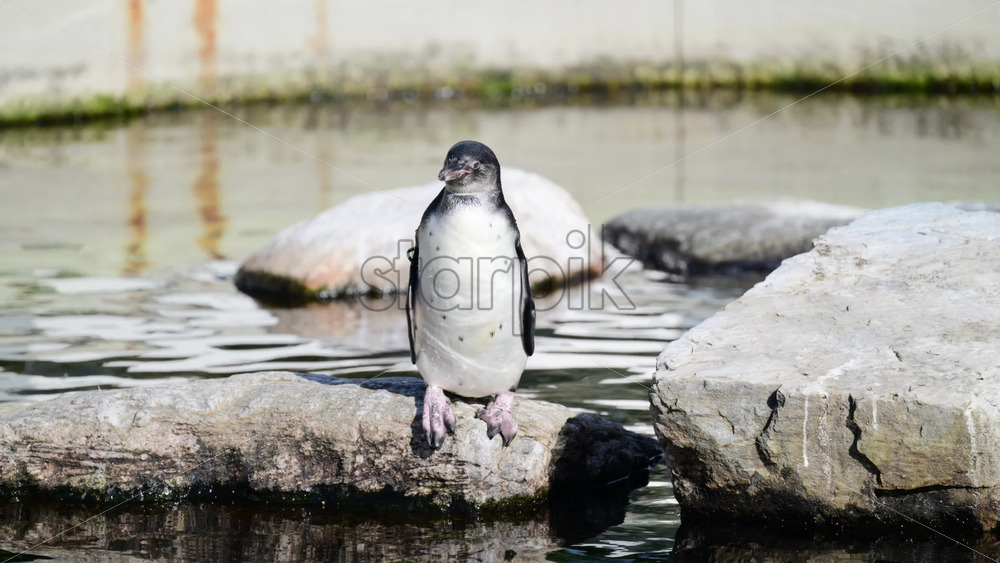 Humboldt penguin showing identification wing tag, standing on rocky ground Royalty Free Stock Video Footage
