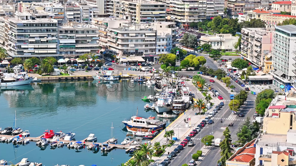 Aerial view of Kavala. Rows of residential buildings, Aegean sea port with moored yachts, roads with people and cars, green hills on the background. Greece Royalty Free Stock Video Footage