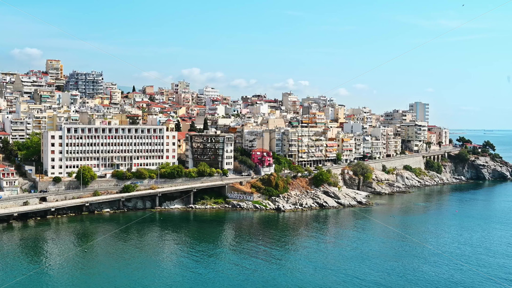 Aerial view of Kavala. Rows of residential buildings, Aegean sea rocky coast, road with cars, hills on the background. Greece Royalty Free Stock Video Footage