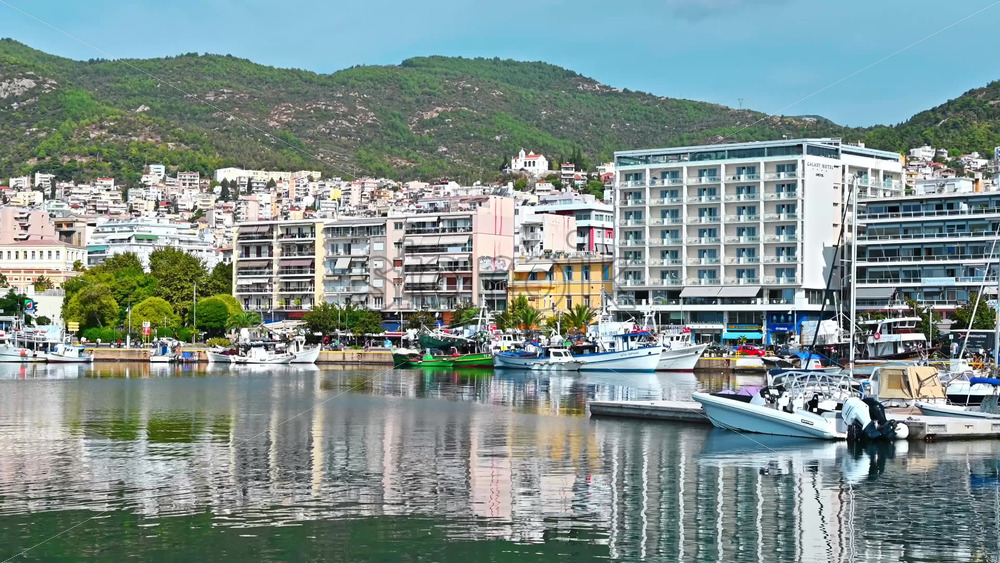 KAVALA, GREECE – SEPTEMBER 23, 2020: Multiple buildings on the Aegean sea coast with port and moored yachts, green hill on the background Royalty Free Stock Video Footage