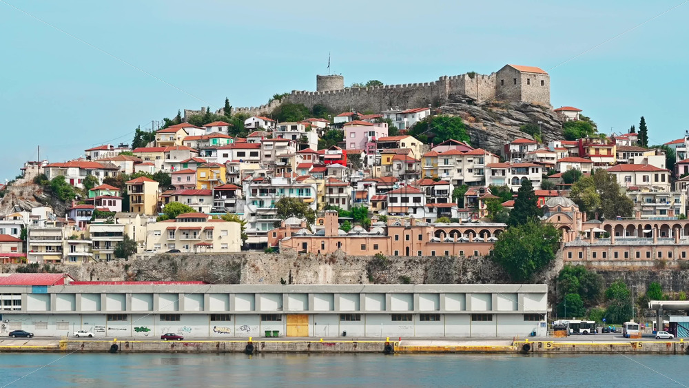 KAVALA, GREECE – SEPTEMBER 23, 2020: View of the town from the water. Rows of residential buildings, ancient fortress on the hill, Aegean sea rocky coast Royalty Free Stock Video Footage