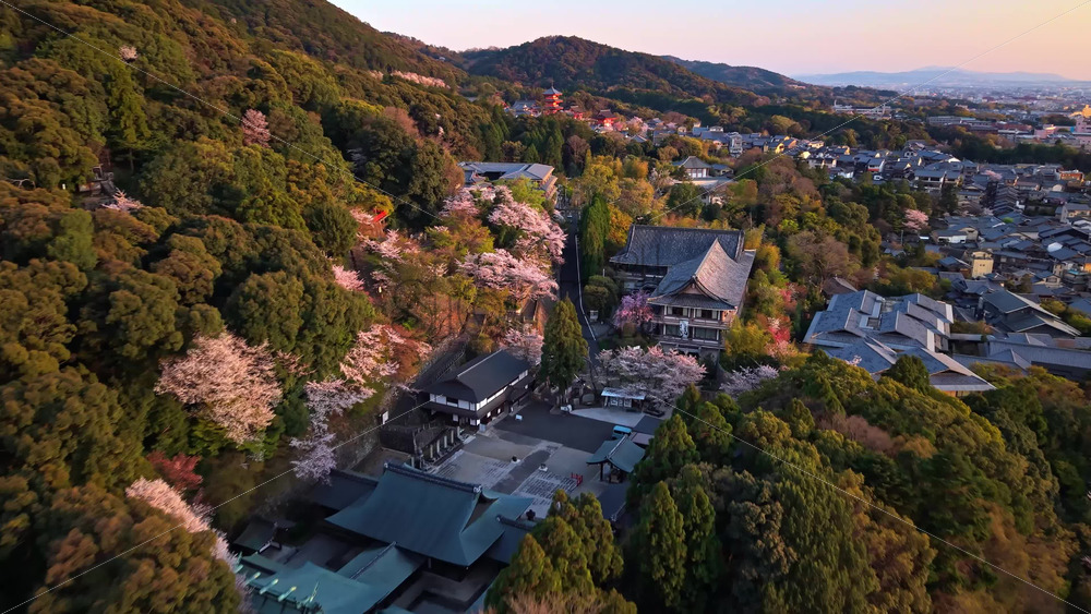 video Kyoto, Japan – April 24, 2025: Aerial drone view of a temple surrounded by cherry blossom at sunset Royalty Free Stock Video Footage