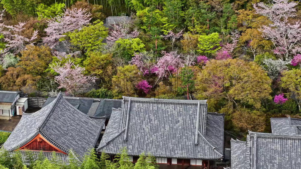 video Kyoto, Japan – April 24, 2025: Aerial drone view of a temple surrounded by cherry blossom at sunset Royalty Free Stock Video Footage
