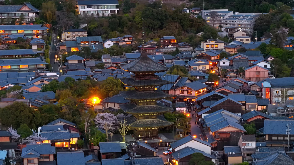 video Kyoto, Japan – April 24, 2025: Aerial drone view of the Yasaka Shrine in the evening Royalty Free Stock Video Footage