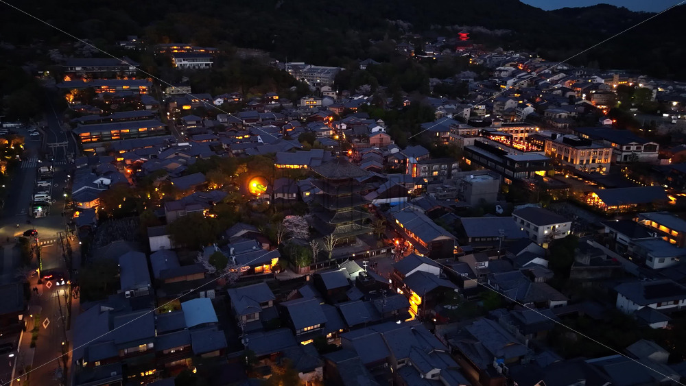 Kyoto, Japan – April 24, 2025: Aerial drone view of the Yasaka Shrine at sunset Royalty Free Stock Video Footage