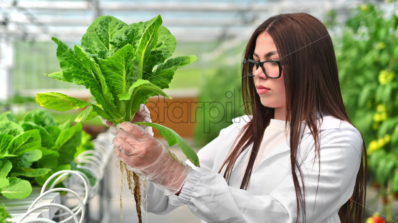VIDEO Laboratory technician in a white coat, analysing lettuce grown with the Hydroponic method in a greenhouse Royalty Free Stock Video Footage