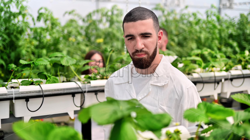 VIDEO Laboratory technician in a white coat, analysing plants grown with the Hydroponic method in a greenhouse Royalty Free Stock Video Footage