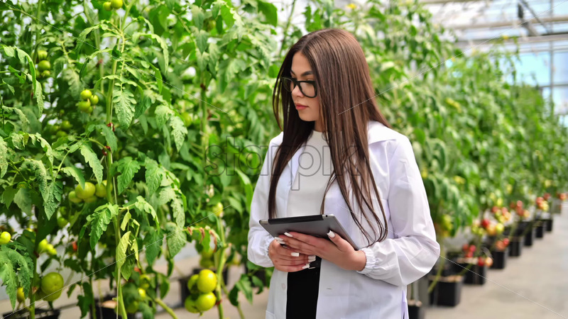 VIDEO Laboratory technician in a white coat analysing tomatoes grown in a greenhouse Royalty Free Stock Video Footage