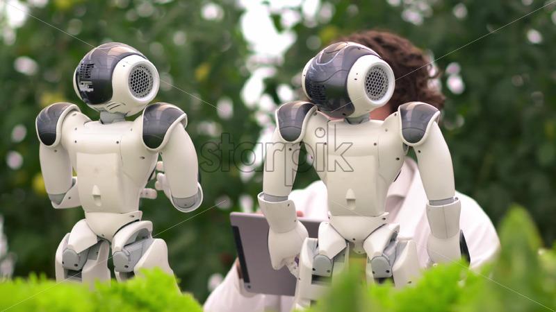 VIDEO Laboratory technician in a white coat holding a tablet and analysing two humanoid robots in a greenhouse farm Royalty Free Stock Video Footage