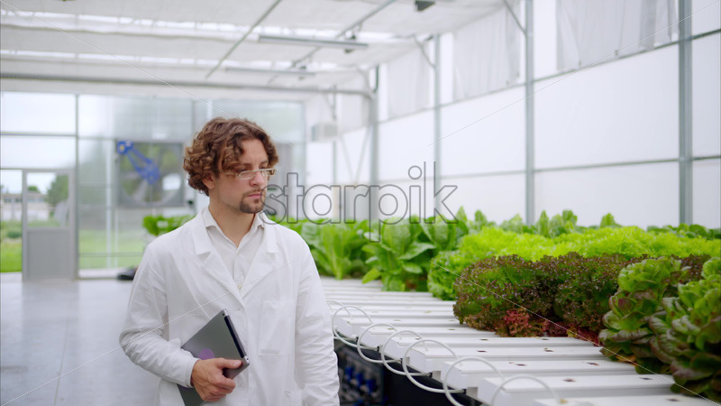 VIDEO Laboratory technician in a white coat, holding a tablet while analysing plants grown with the Hydroponic method in a greenhouse Royalty Free Stock Video Footage