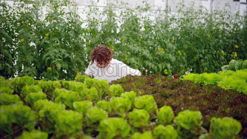 Home » Shop » 1 Video » people » Video Laboratory technician in a white coat, holding a tablet while analysing plants grown with the Hydroponic method in a greenhouse