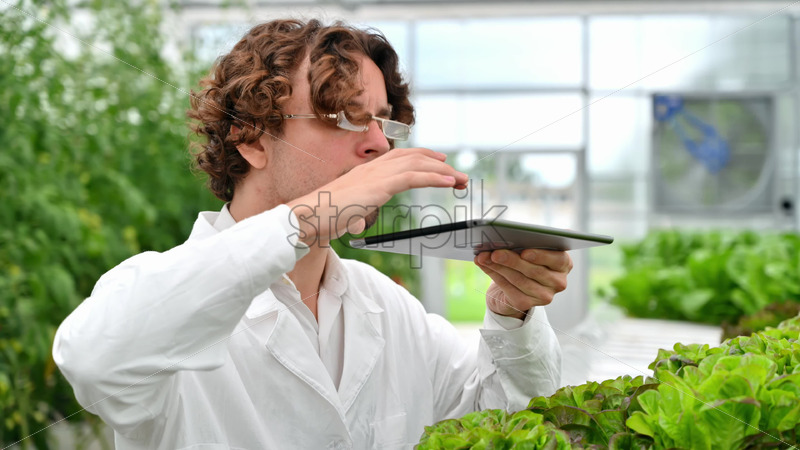 Home » Shop » 1 Video » people » Video Laboratory technician in a white coat, holding a tablet while analysing plants grown with the Hydroponic method in a greenhouse