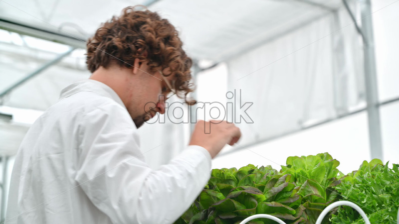 VIDEO Laboratory technician in a white coat, holding a tablet while analysing plants grown with the Hydroponic method in a greenhouse Royalty Free Stock Video Footage