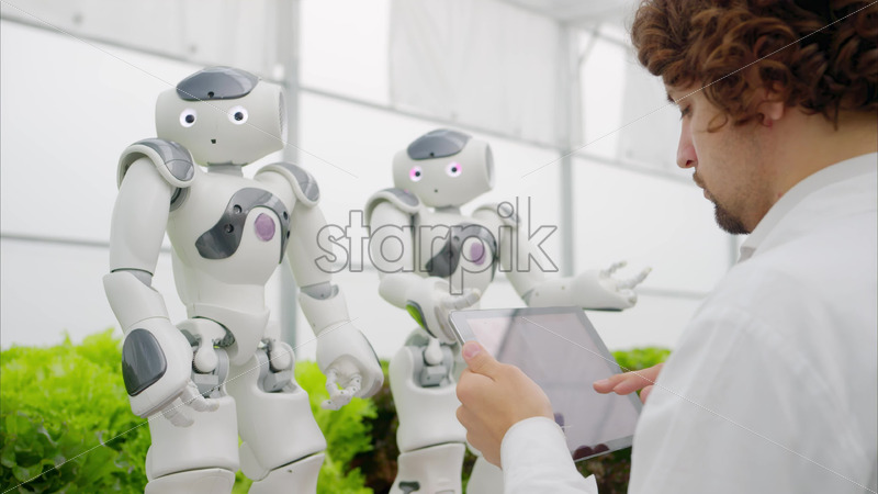 VIDEO Laboratory technician in a white coat holding a tablet while analysing two humanoid robots in a greenhouse farm Royalty Free Stock Video Footage