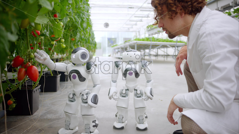 VIDEO Two humanoid robots and a laboratory technician standing near rows of tomatoes in a greenhouse farm Royalty Free Stock Video Footage
