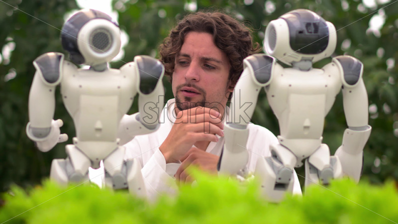 VIDEO Laboratory technician in a white coat interacting with two humanoid robots near different types of lettuce in a greenhouse farm Royalty Free Stock Video Footage