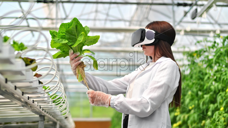 VIDEO Laboratory technician in a white coat wearing a Virtual Reality headset, analysing lettuce grown with the Hydroponic method in a greenhouse Royalty Free Stock Video Footage