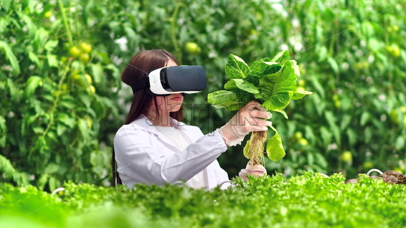 Home » Shop » 1 Video » people » Video Laboratory technician in a white coat wearing a Virtual Reality headset, analysing lettuce grown with the Hydroponic method in a greenhouse