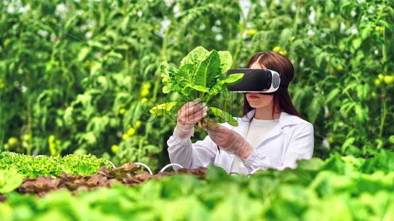 Home » Shop » 1 Video » people » Video Laboratory technician in a white coat wearing a Virtual Reality headset, analysing lettuce grown with the Hydroponic method in a greenhouse