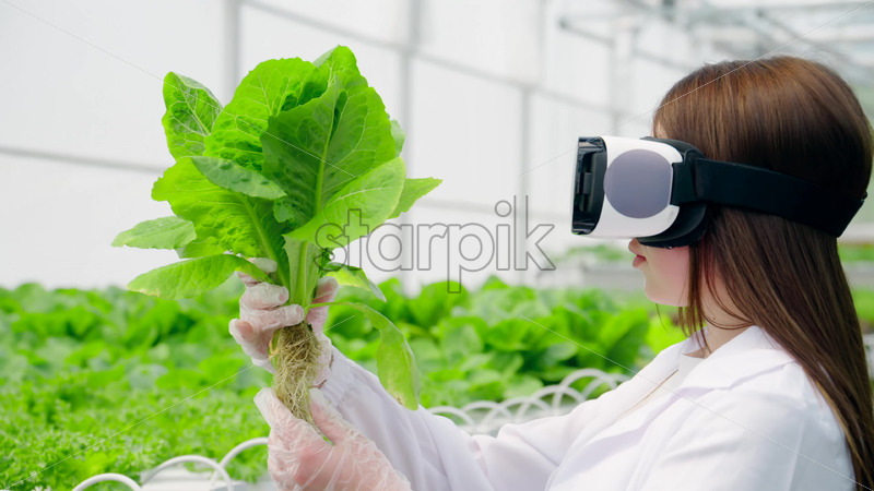 Home » Shop » 1 Video » people » Video Laboratory technician in a white coat wearing a Virtual Reality headset, analysing lettuce grown with the Hydroponic method in a greenhouse