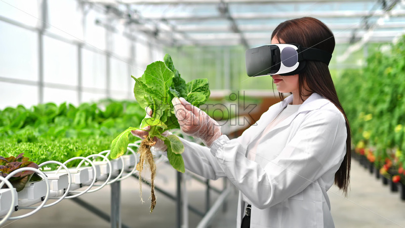 VIDEO Laboratory technician in a white coat wearing a Virtual Reality headset, analysing lettuce grown with the Hydroponic method in a greenhouse Royalty Free Stock Video Footage