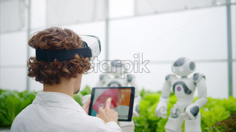 VIDEO Laboratory technician in a white coat wearing virtual reality headset analysing graphs on a tablet while interacting with two humanoid robots in a greenhouse farm Royalty Free Stock Video Footage