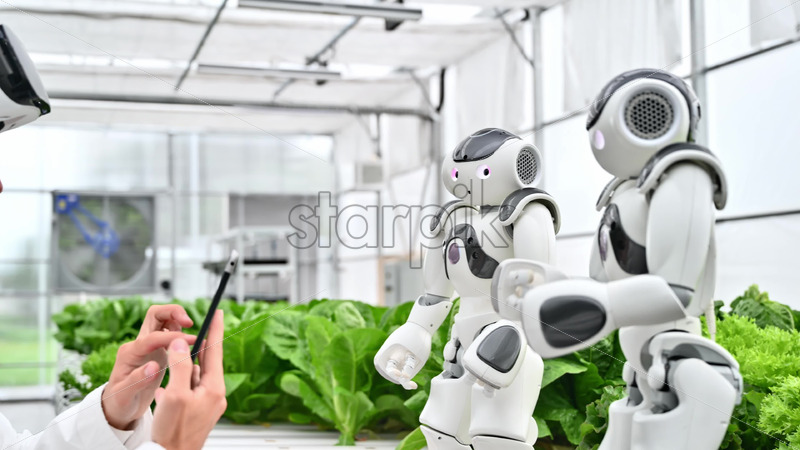 VIDEO Laboratory technician in a white coat holding a tablet while analysing two humanoid robots in a greenhouse farm Royalty Free Stock Video Footage
