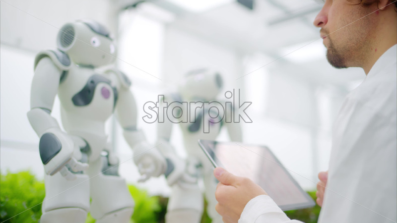VIDEO Laboratory technician in a white coat with virtual reality headset holding a tablet while analysing two humanoid robots in a greenhouse farm Royalty Free Stock Video Footage