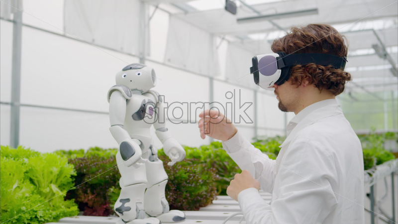 VIDEO Laboratory technician in a white coat wearing virtual reality headset interacting with humanoid robot near different types of lettuce in a greenhouse farm Royalty Free Stock Video Footage