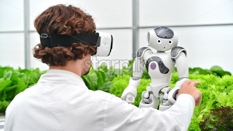 VIDEO Laboratory technician in a white coat wearing virtual reality headset interacting with humanoid robot near different types of lettuce in a greenhouse farm Royalty Free Stock Video Footage