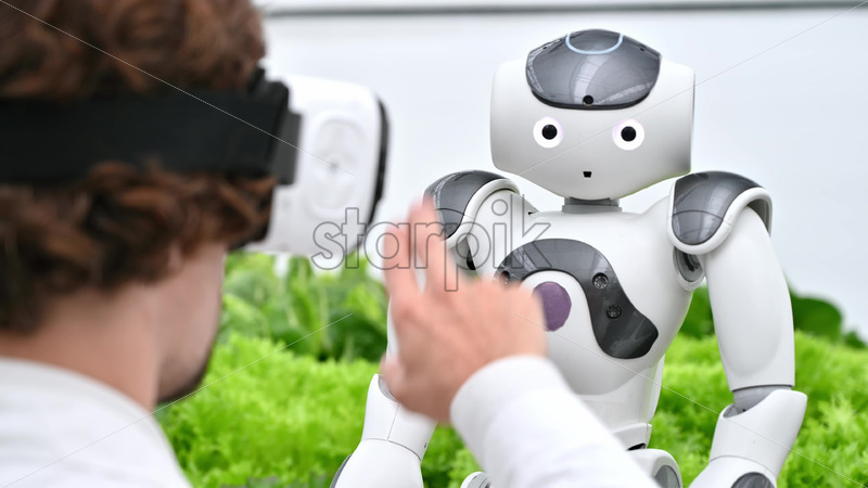 VIDEO Laboratory technician in a white coat wearing virtual reality headset interacting with humanoid robot near different types of lettuce in a greenhouse farm Royalty Free Stock Video Footage